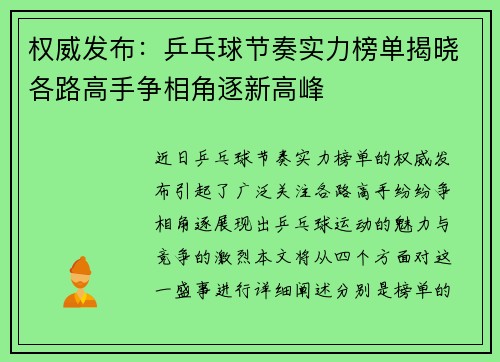 近日,乒乓球节奏实力榜单的权威发布引起了广泛关注,各路高手纷纷争相角逐,展现出乒乓球运动的魅力与竞争的激烈。本文将从四个方面对这一盛事进行详细阐述,分别是榜单的评选标准、参赛选手的表现、赛事的影响力以及未来的发展趋势。通过对这些方面的分析,我们可以更深入地理解乒乓球节奏实力榜单的意义,以及它对乒乓球...